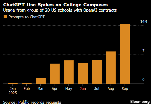 ChatGPT 在校园中迅速流行。根据与 OpenAI 签约的 20 所大学的数据,9 月份学生和教授使用 ChatGPT 的次数超过 1400 万次。平均而言,每个用户每月使用 ChatGPT 176 次来执行编辑、研究和数据分析等任务。